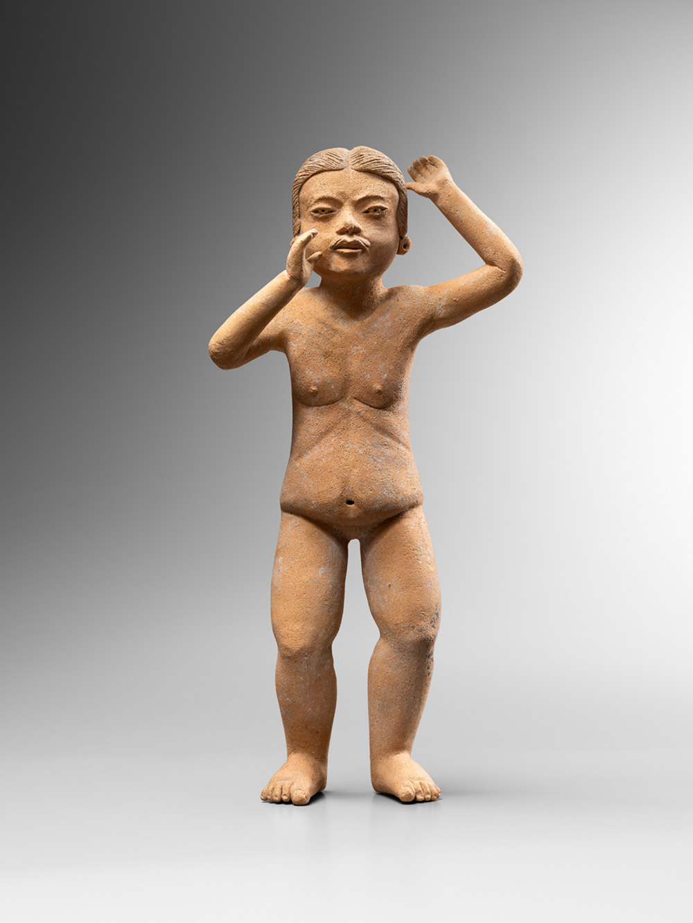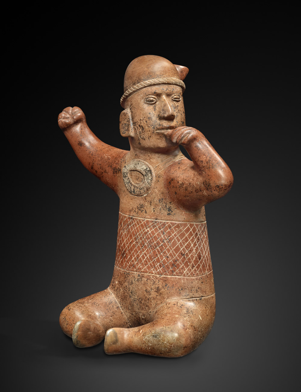 Personnage assis, les bras levés