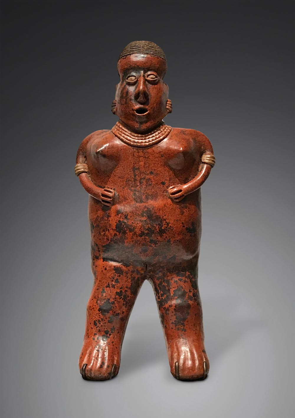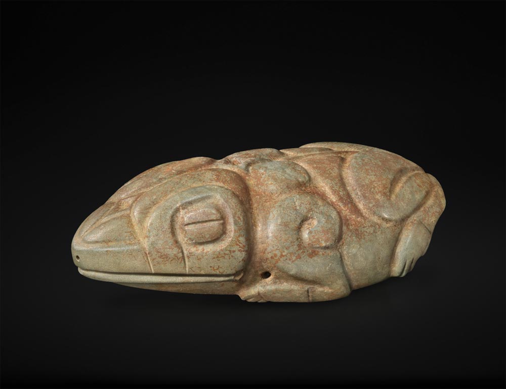Une sélection qui embrasse un grand nombre de cultures du Mexique et des Andes. Parmi les œuvres exposées : un masque chontal, modèle de pureté et de solennité, sculpté dans une intense serpentine verte veinée, un grand excentrique maya représentant le Dieu K’awill, taillé dans une obsidienne aussi tranchante que le verre avec une technique qu’aucun tailleur contemporain n’a réussi à reproduire, un serpent à plumes aztèque en basalte, l’une des incarnations du mythique Quetzalcoatl, mais aussi un trio de masques d’Argentine rarissimes, expressifs à souhait, un superbe pectoral en or de Colombie et un poncho du Pérou aux couleurs chatoyantes, illustrant à eux deux la maîtrise atteinte dans l’orfèvrerie et l’art textile en Amérique du Sud. Un inventaire à la Prévert où l’étrange est toujours fascinant et lumineux pour peu que l’on s’y attarde.