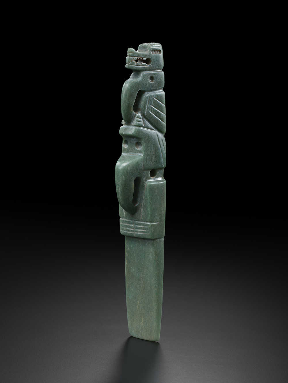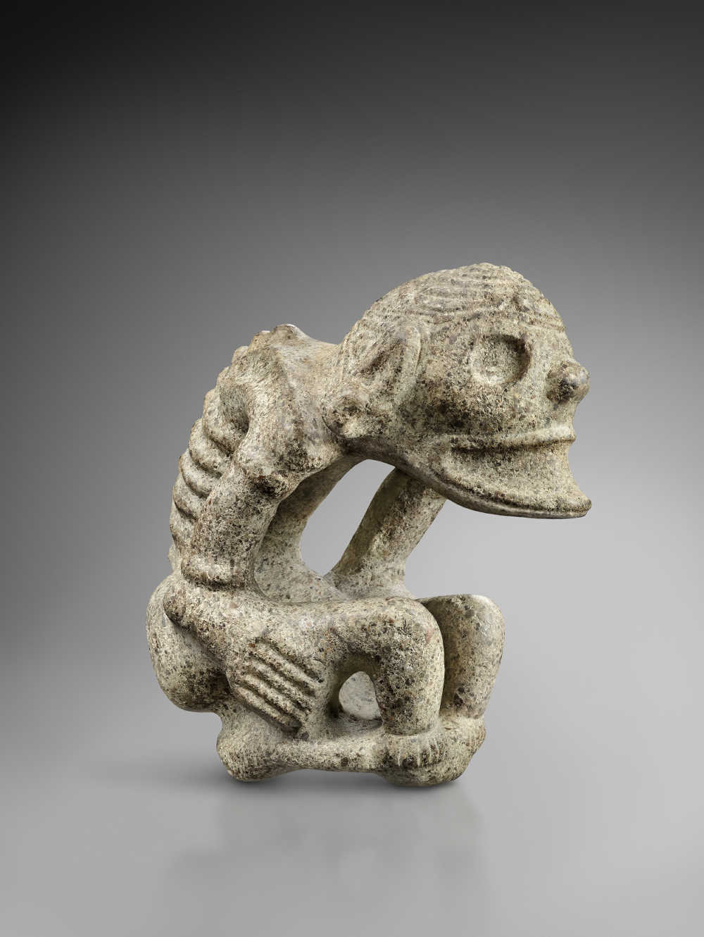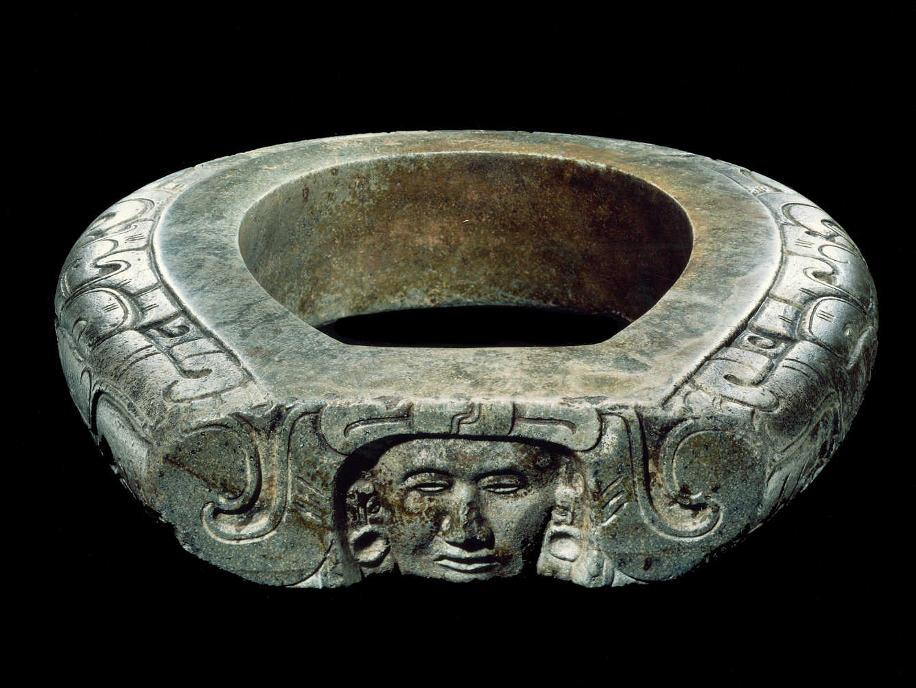 Ceinture cérémonielle en forme de joug fermé sculpté avec deux profils de dragons vis-à-vis encadrant un visage humain
