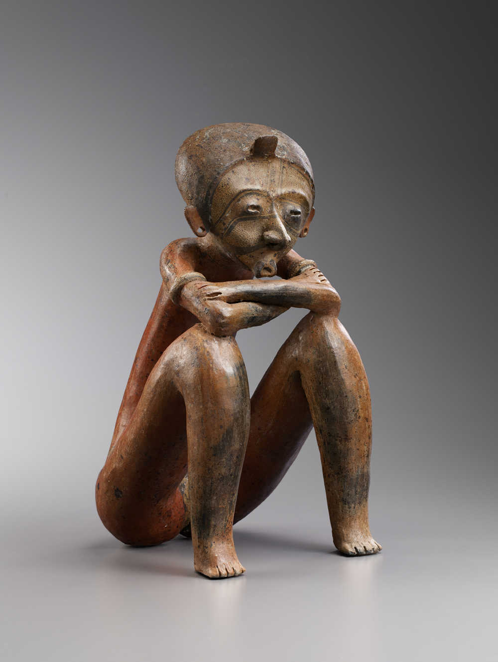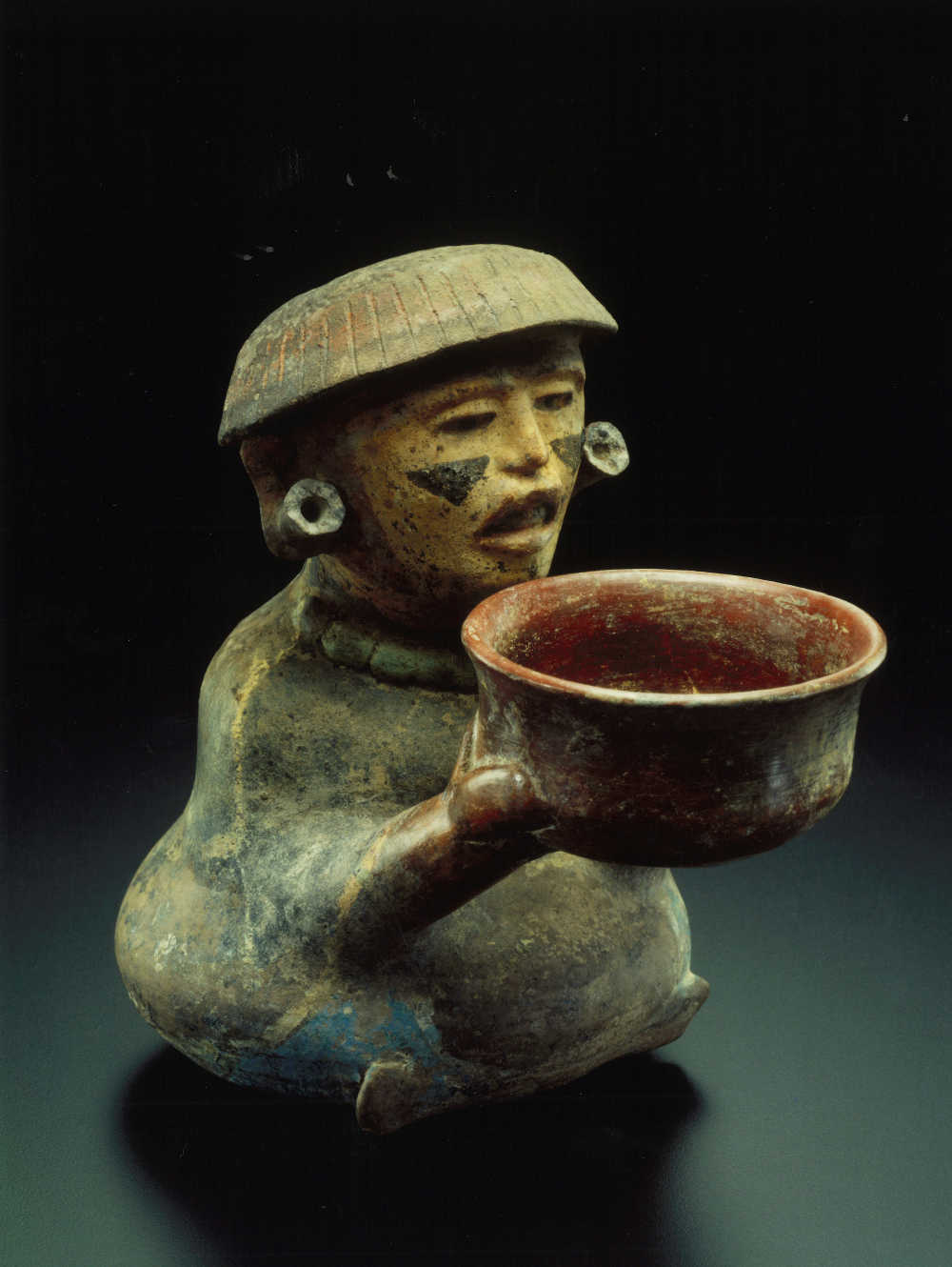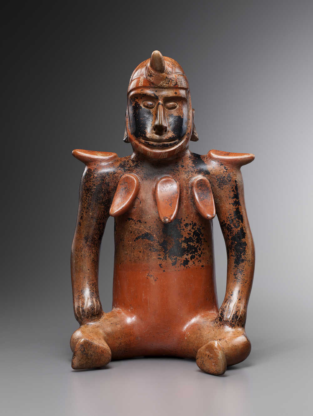 Terre cuite creuse brune à engobe rouge brun sur le corps et à engobe beige brun sur la tête. Traces d'oxyde de manganèse