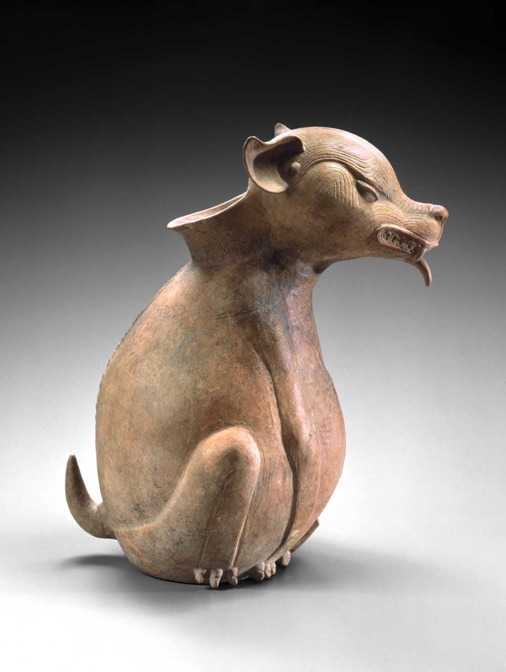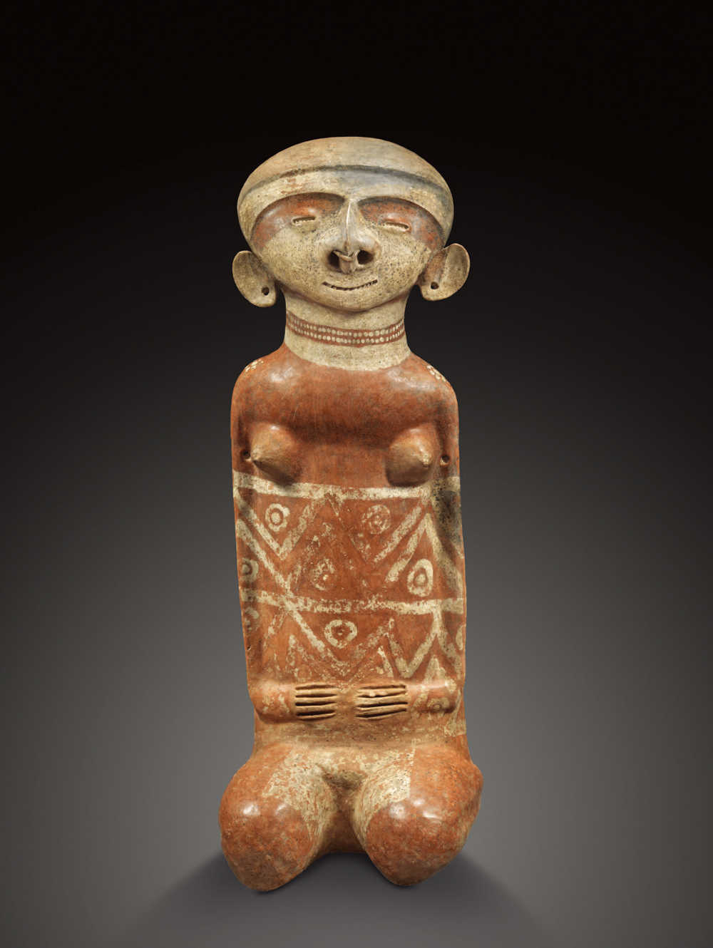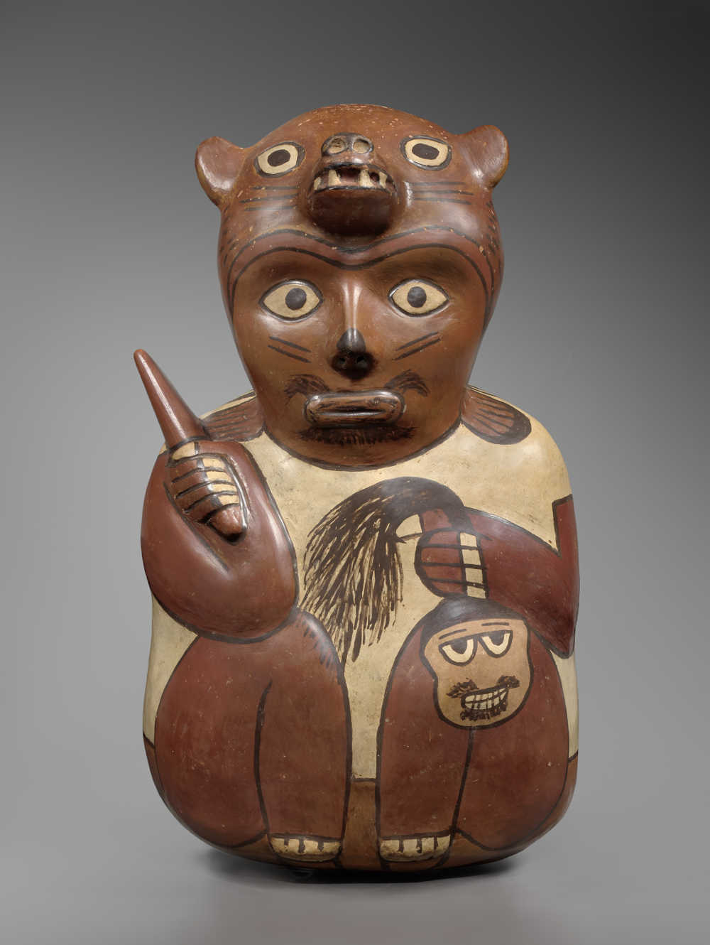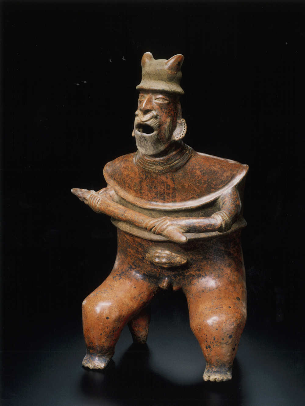 Terre cuite creuse brune à engobe rouge brun sur le corps et à engobe beige brun sur la tête. Traces d'oxyde de manganèse