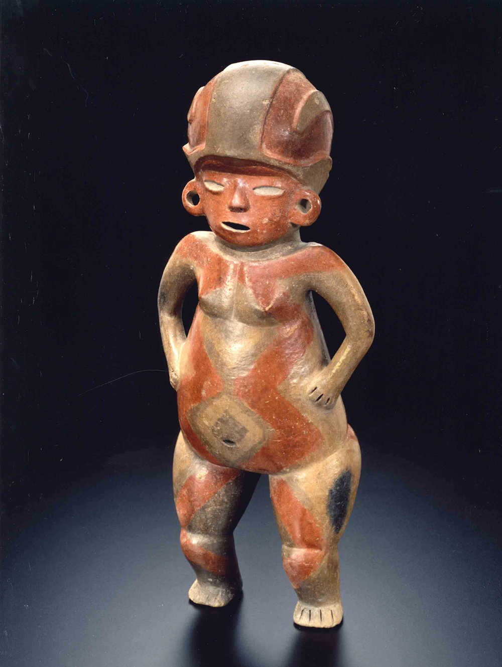 Terre cuite creuse brune à engobe brun-orange et polychromies