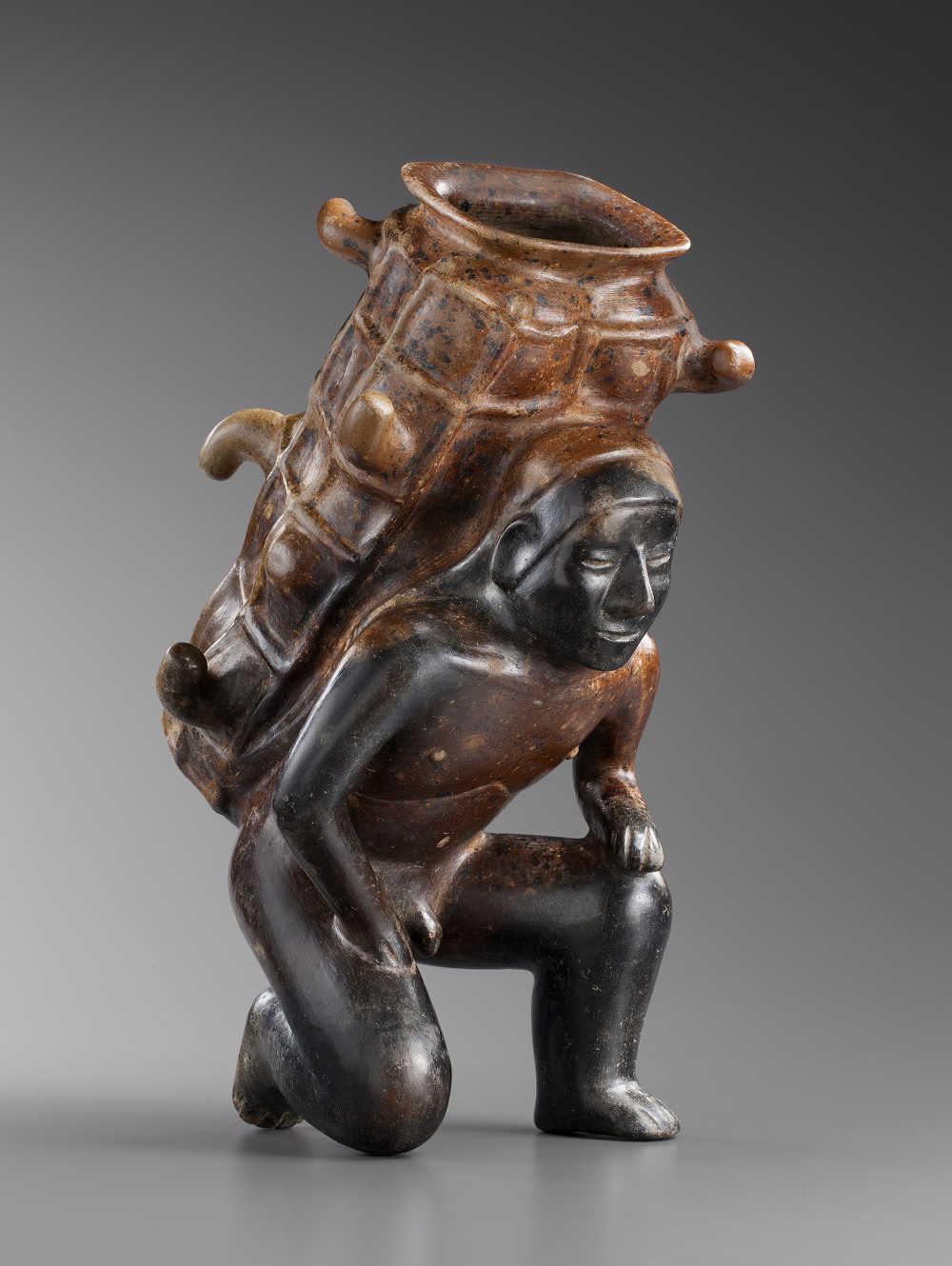 Terre cuite creuse brune à engobe brun, recouverte d'importantes traces d'oxyde de manganèse